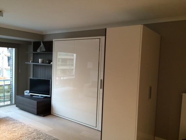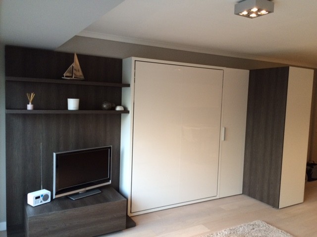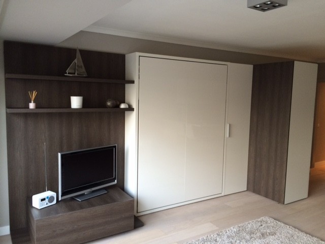 Complete bedkastenwand geplaatst naar wens en indeling van de klant. De klant heeft gekozen voor bedkast model Ulisse Big, een boiseriepaneel met tv meubel en een dichte legkast ernaast. Tevens haaks nog een diepe kast geplaatst als divider van de kamer, om zo meer een zithoek te creëren aan de ene kant en aan de andere kant meer de keuken te houden.